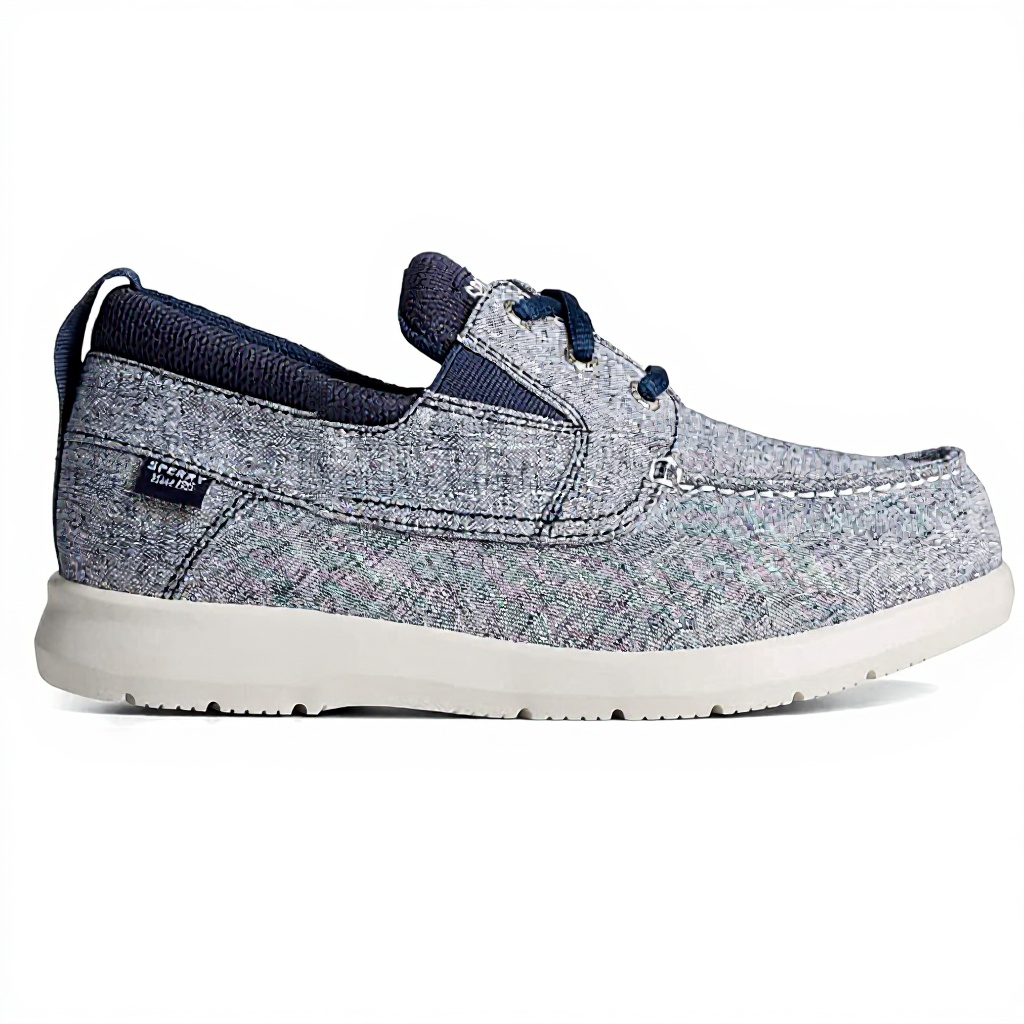 Ces chaussures bateau sont disponibles en plusieurs pointures européennes allant du 40 au 45, avec des options en largeur standard et large pour s’adapter à différentes morphologies. Le modèle STS24844 présente des dimensions de 25,4 x 38,1 x 15,24 cm et est exclusivement proposé en coloris Chambray Navy. La construction intègre un col rembourré pour un confort accru et des lacets décoratifs à trois œillets pour un style authentique.
