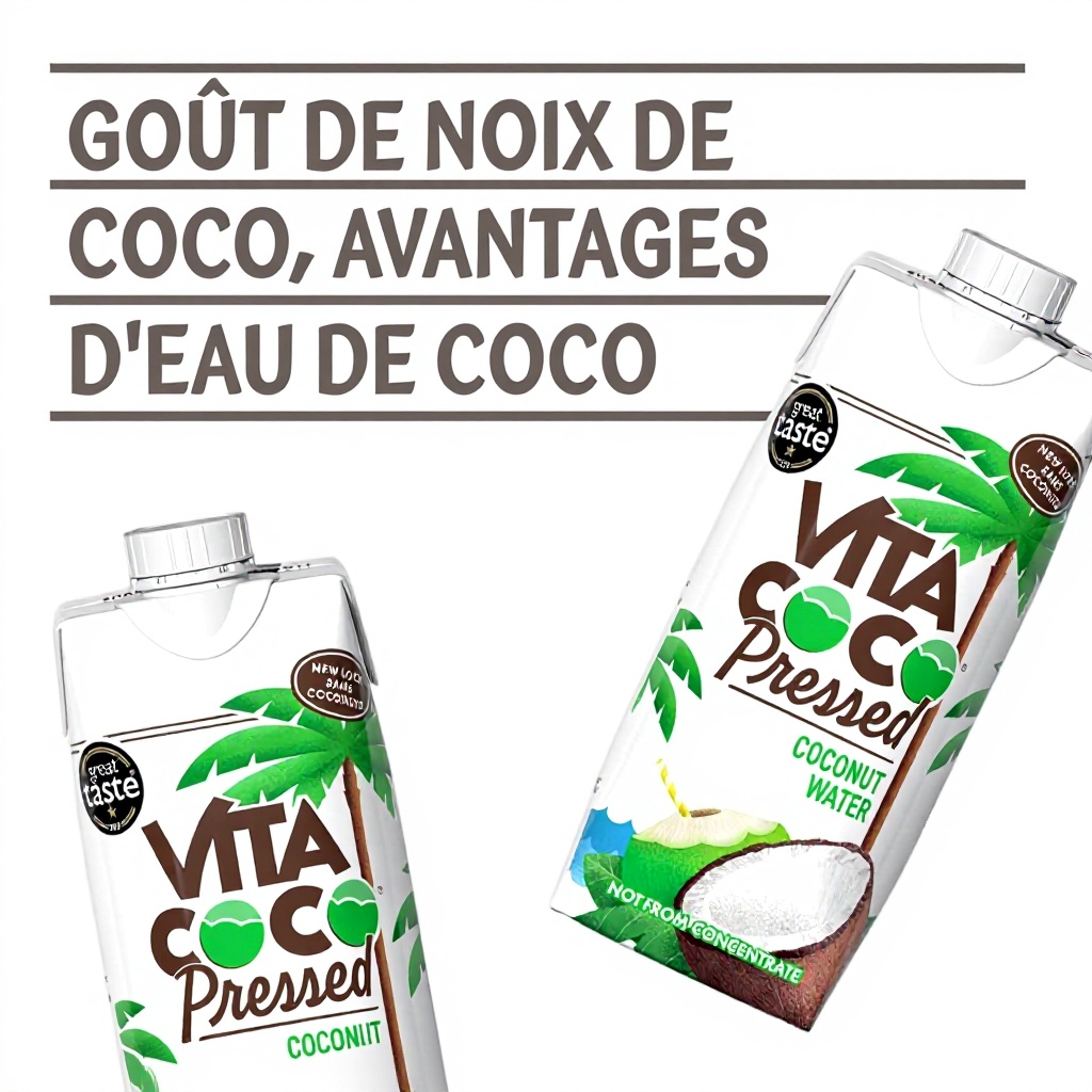 L’eau de coco Vita Coco est pressée naturellement, offrant une source d’hydratation riche en électrolytes comme le potassium, le calcium et le magnésium. Elle contient plus de vitamine C qu’une orange et plus de potassium qu’une banane, le tout sans gluten, avec très peu de calories et adaptée aux régimes végétaliens.