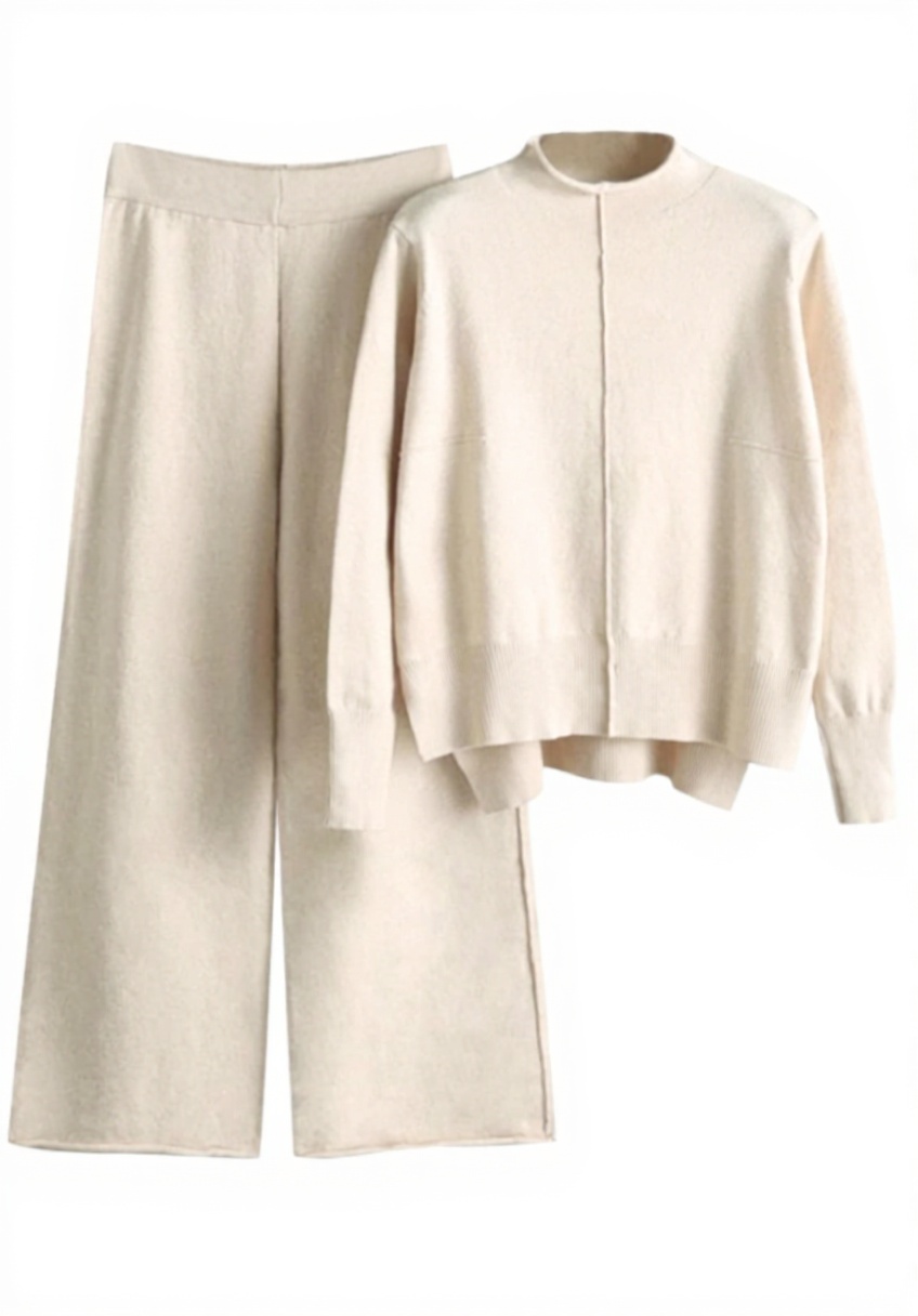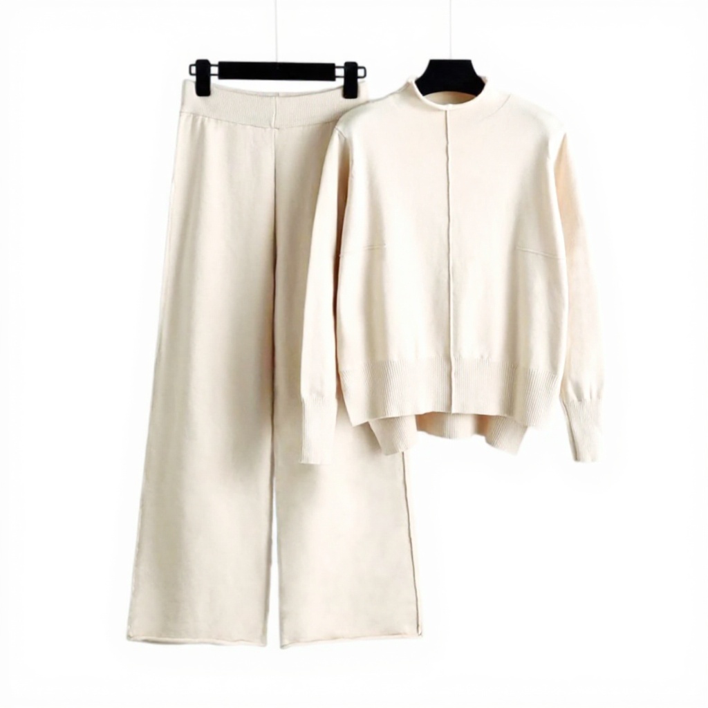Cet ensemble 2 pièces se compose d’un pull tricoté à col montant et d’un pantalon à jambes larges, offrant un look chic et décontracté. Fabriqué en matériau tricoté doux, il assure un confort optimal tout en maintenant une élégance simple avec ses couleurs de base comme le noir, le beige et le kaki. La conception à taille haute et élastique garantit une adaptation parfaite à diverses morphologies.