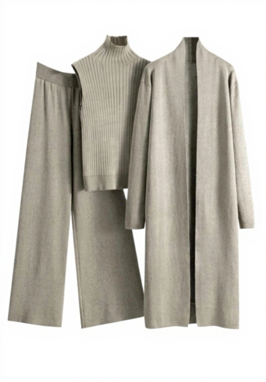 Cet ensemble 3 pièces se compose d’un cardigan, d’un pull et d’un pantalon en tissu tricoté doux et respirant. Conçu pour les loisirs, il offre une sensation de chaleur et de confort tout en restant élégant et polyvalent.