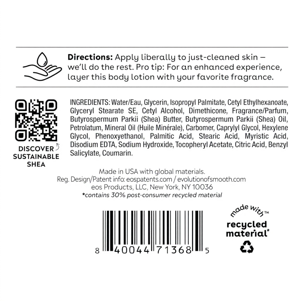 Le flacon de 473 ml mesure 9,91 x 4,57 x 20,32 cm et pèse 453,59 grammes. Fabriqué par eos, le modèle 2040702 est conçu pour un usage quotidien, avec une texture fluide qui facilite l’application.