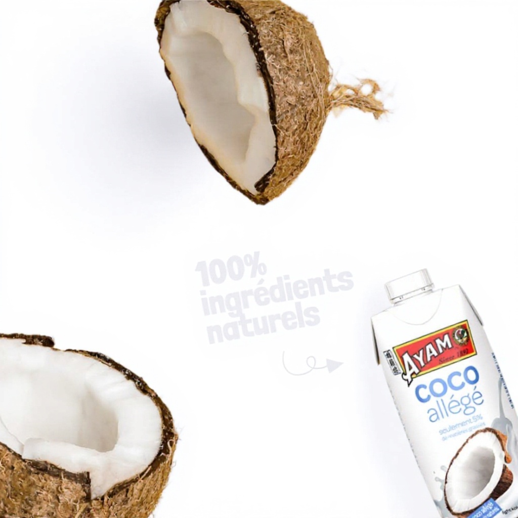 Le lait de coco allégé AYAM est élaboré à partir de noix de coco fraîches et mûres, avec 99% de coco et un boost d’eau de coco pour une texture onctueuse. Réduit de 75% en matières grasses, il conserve un goût authentique tout en étant sans lactose et sans gluten, répondant aux besoins des régimes spécifiques.