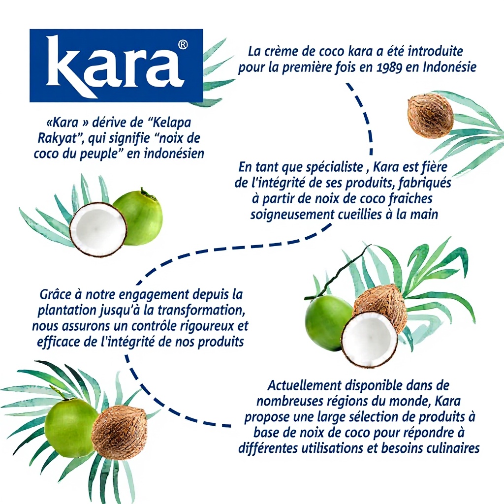 Le lait de coco Kara se distingue par son goût intense et naturel, obtenu à partir de noix de coco fraîchement cueillies à la main en Indonésie. Ce produit fluide est sans conservateur et sans gluten, garantissant une qualité pure et authentique pour toutes vos préparations culinaires.