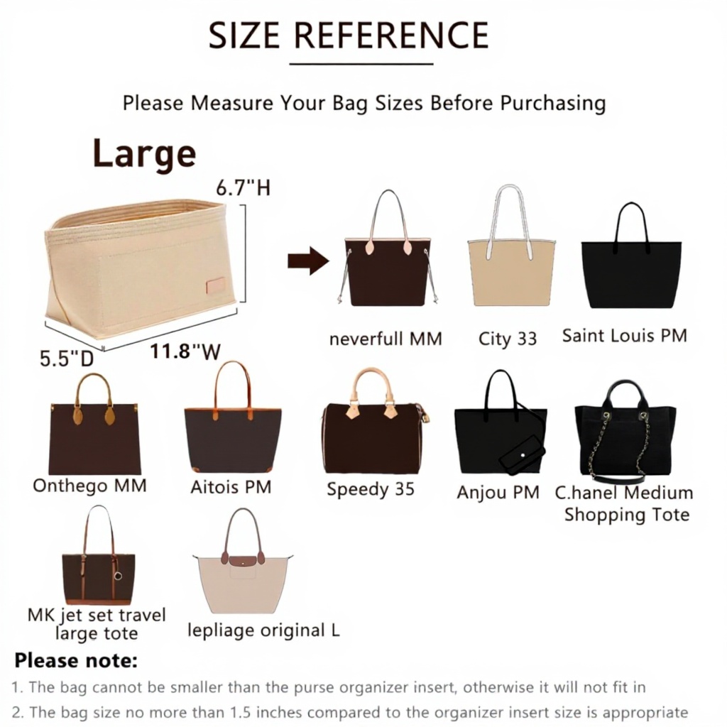 Mesurez la largeur intérieure, la profondeur et la hauteur de votre sac, puis comparez avec notre tableau des tailles. La taille L convient aux sacs comme Neverfull MM ou Coach City 33.