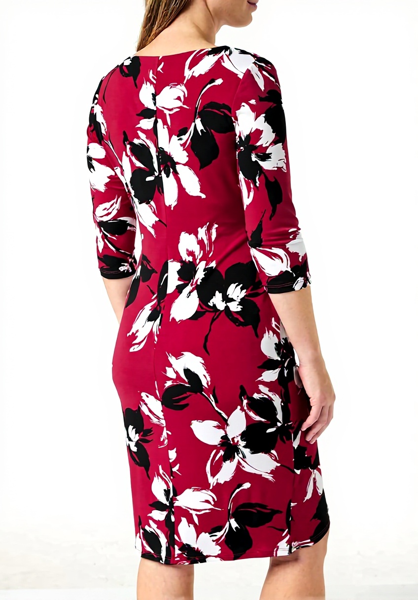 Cette robe cocktail de Gina Bacconi se distingue par son imprimé floral élégant et sa coupe portefeuille ajustée en jersey extensible. Les manches 3/4 et le col en V ajoutent une touche de sophistication, tandis que l’ourlet fendu avec détails en cascade crée une silhouette flatteuse et moderne.