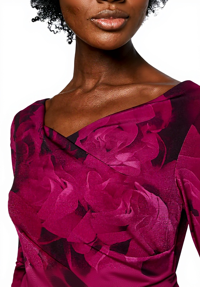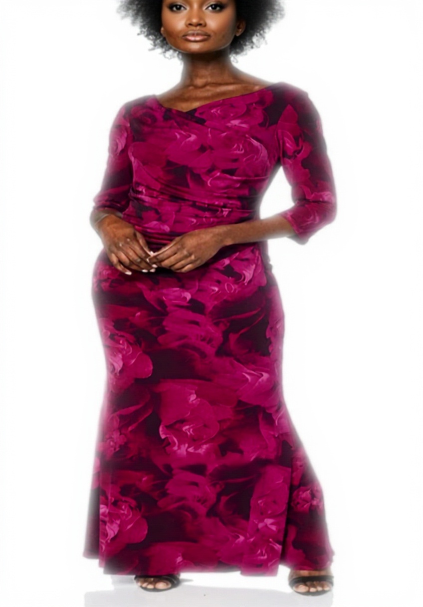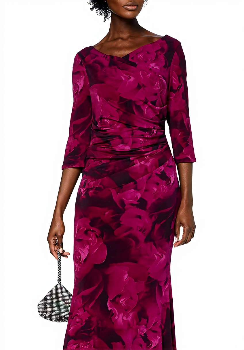 Cette robe cocktail de Gina Bacconi se distingue par son design floral élégant et sa coupe longue. Confectionnée en jersey imprimé floral extensible, elle offre une silhouette enveloppante avec des fronces délicates au corsage. Les manches mi-longues et le col en V ajoutent une touche de sophistication, tandis que le tissu assure une liberté de mouvement et un confort durable.