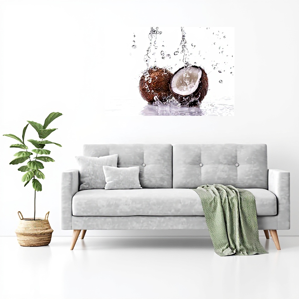 Dimensions : 100 x 70 x 0,4 cm, poids de 4 kg. Matériau acrylique de haute qualité, couleur marron avec motif coco et eau. Modèle tw2-ean-oah2s-100×70-f-53134476, livré avec tampons adhésifs et entretoises pour une fixation simple.