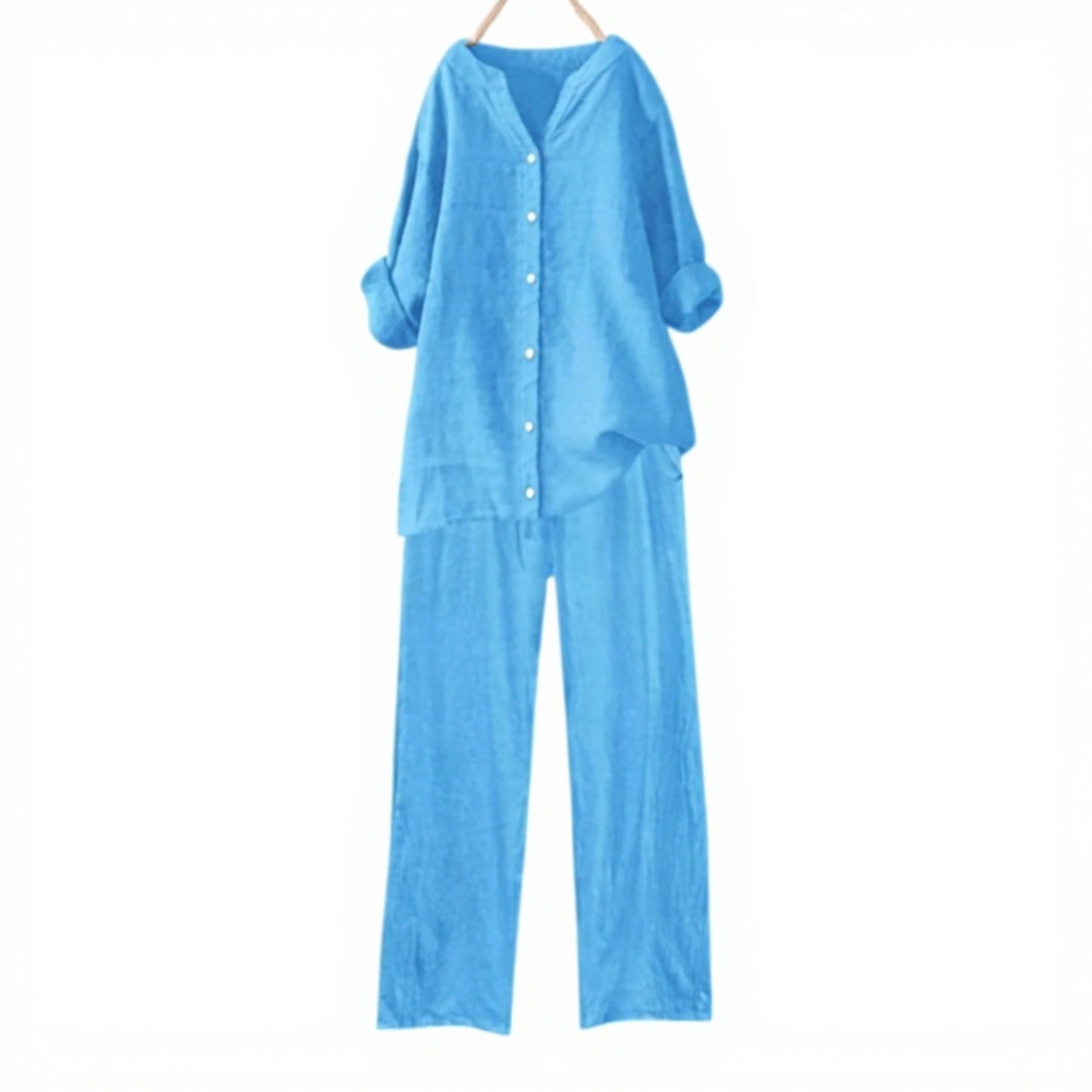 Cet ensemble deux pièces pour femme est confectionné en tricot doux et respirant, offrant un confort optimal toute la journée. Le chemisier décontracté présente un col en V élégant et une coupe ample, tandis que le pantalon à jambes larges et taille haute assure une silhouette flatteuse. Des poches fonctionnelles et une ceinture élastique complètent ce design pratique et stylé.