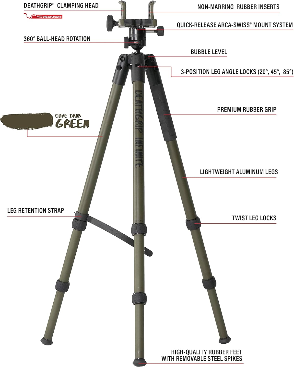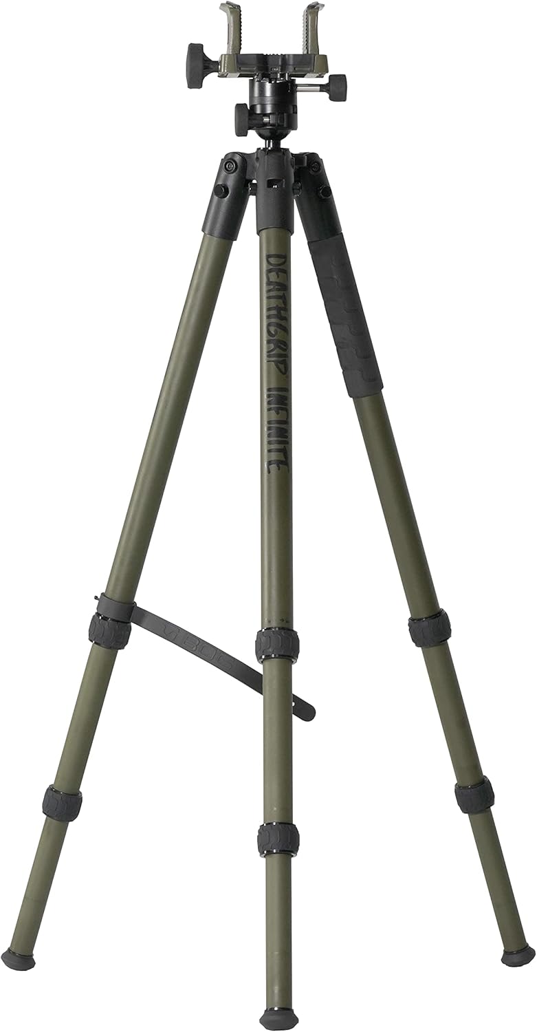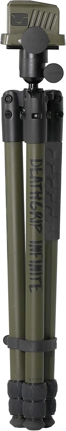 Le trépied DeathGrip Infinite combine une construction en aluminium robuste avec une tête sphérique permettant une rotation à 360° pour un positionnement précis. Son système de montage Arca-Swiss à dégagement rapide facilite le changement entre la plaque optique incluse et le serre-tête DeathGrip, offrant une polyvalence immédiate sur le terrain.