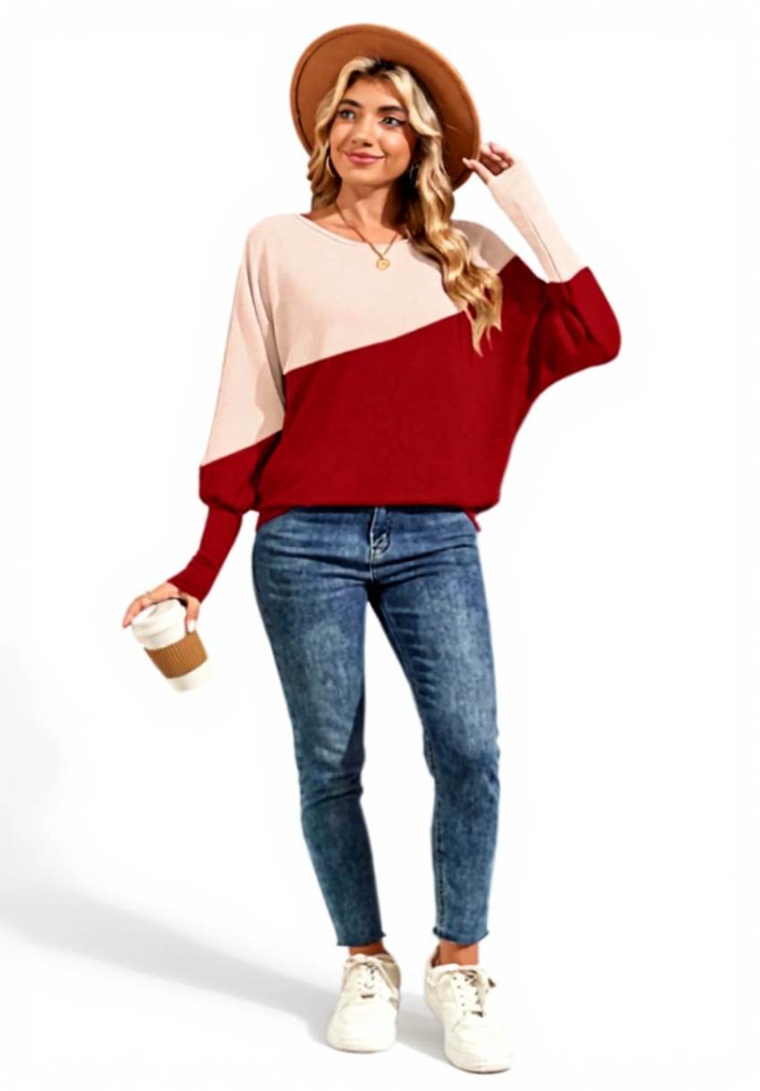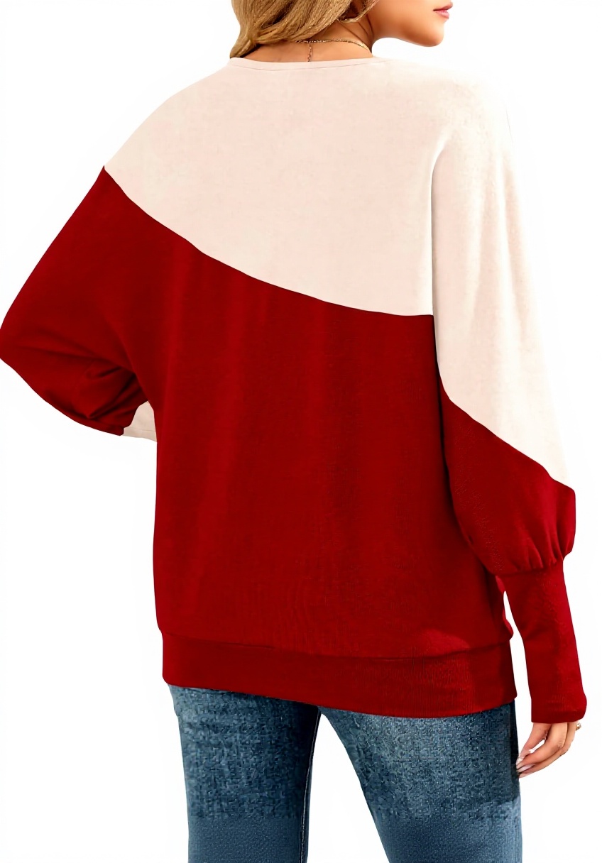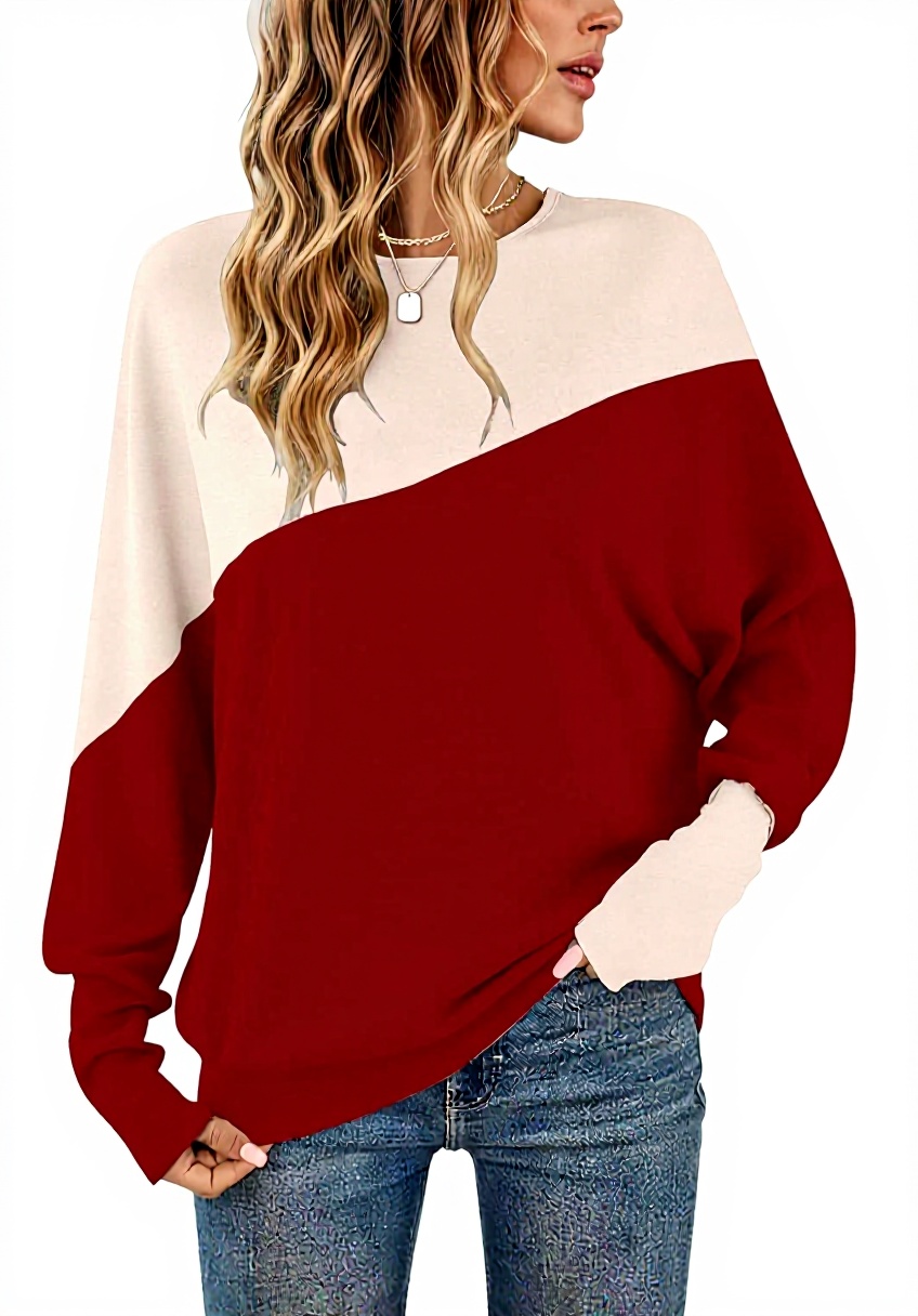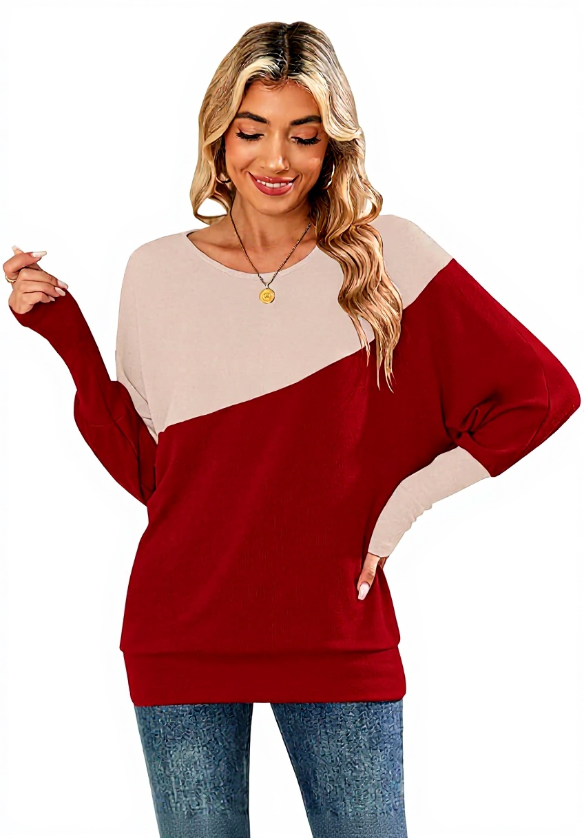 Ce T-shirt à manches longues se distingue par son design patchwork aux couleurs contrastées, offrant un look unique et moderne. Fabriqué en tissu doux et respirant, il assure un confort optimal tout en dissimulant les imperfections grâce à ses manches chauve-souris et ses poignets serrés. Idéal pour les saisons fraîches, il allie élégance et praticité.